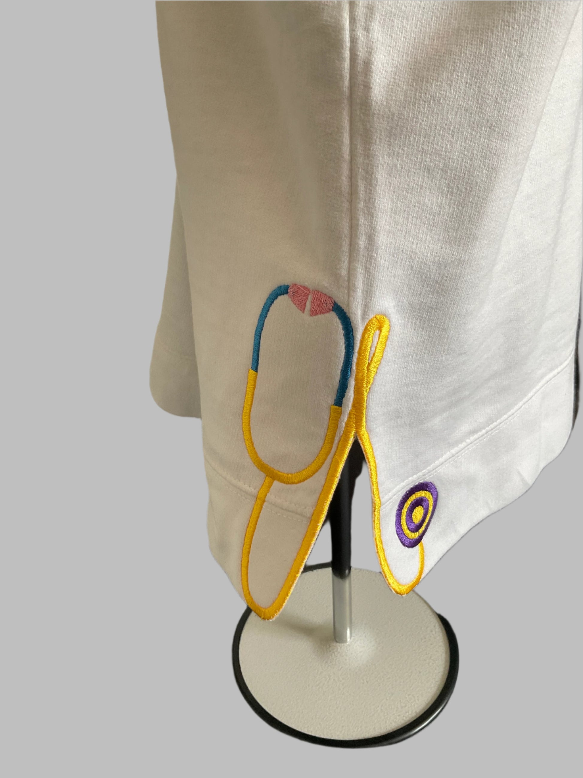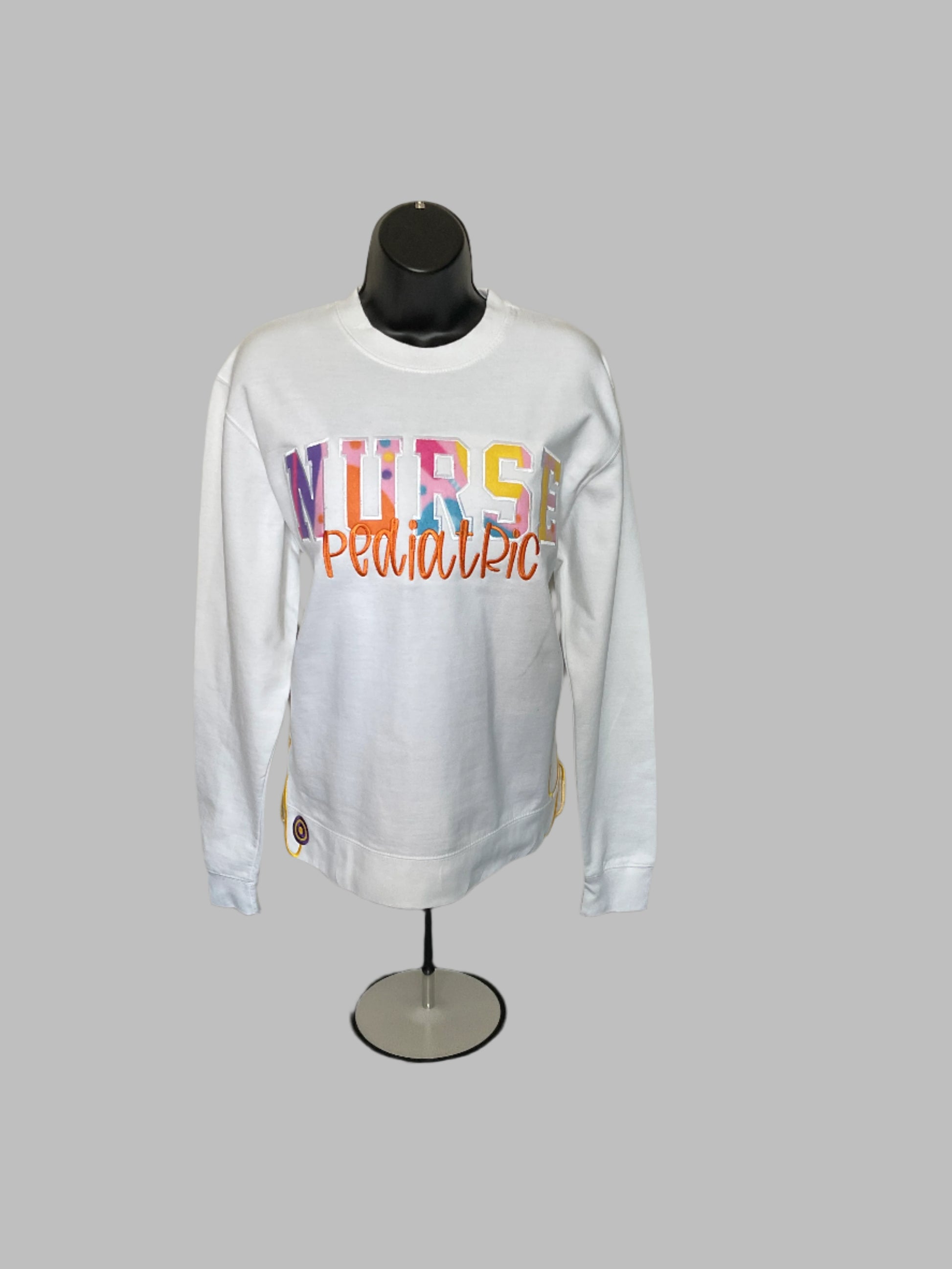 This shirt is customizable by changing the thread colors for the word nurse, pediatric, and the stethoscope.