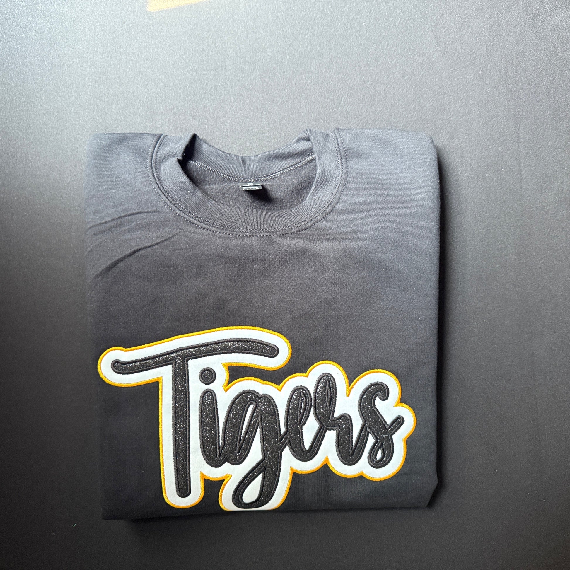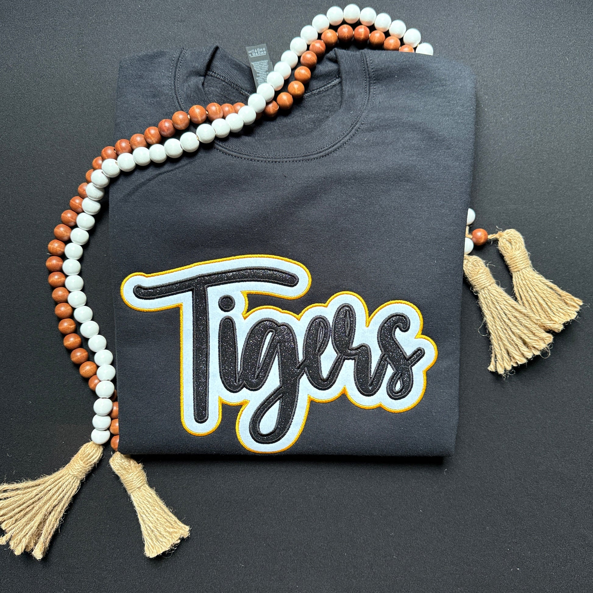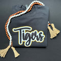 Please complete the personalization section with the color of thread for Tigers and the color thread for your background HTV Flock color.